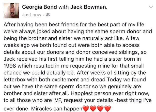 Seperti yang dilansir dari Daily Mail, Georgia Bond (19) dan Jack Bowman (26) ternyata memiliki ayah kandung yang sama.